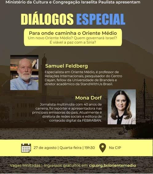 – MINISTÉRIO DA CULTURA E CONGREGAÇÃO ISRAELITA PAULISTA REALIZAM DEBATE SOBRE O FUTURO DO ORIENTE MÉDIO – Na CIP, dia 27-08, às 19h30, com o especialista em Oriente Médio Samuel Feldberg e mediação da jornalista Mona Dorf.