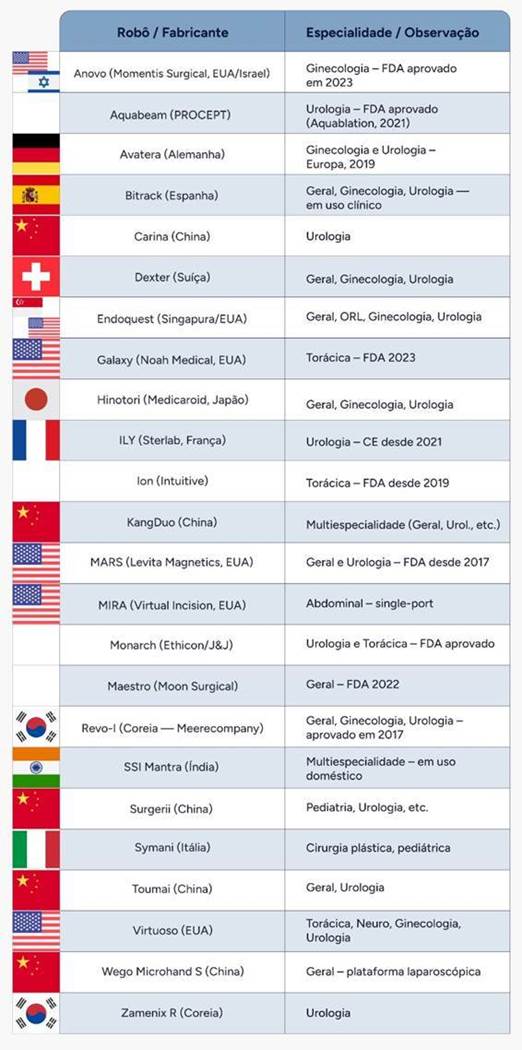 O sistema da Vinci continua sendo o padrão-ouro em cirurgia robótica, usado em prostatectomias, nefrectomias, cistectomias, pieloplastias e diversas cirurgias urológicas. Entretanto, surgem cada vez mais alternativas competitivas ampliando opções de mercado e reduzindo custos operacionais. Aqui ilustro com a tabela de novos robôs, fabricantes e especialidades. Esses sistemas emergentes oferecem inovação, flexibilidade e, em alguns casos, portabilidade superior que favorece adoção em centros menores e regiões mais remotas.
