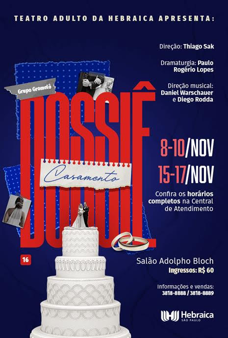 O Grupo Gromelô apresentará na Hebraica a peça “Dossiê Casamento”, dirigida por Thiago Sak e com dramaturgia de Paulo Rogério Lopes. Com classificação indicativa de 16 anos, a comédia dramática aborda os bastidores de um casamento por meio de uma narrativa que mistura humor, ironia e investigação teatral.