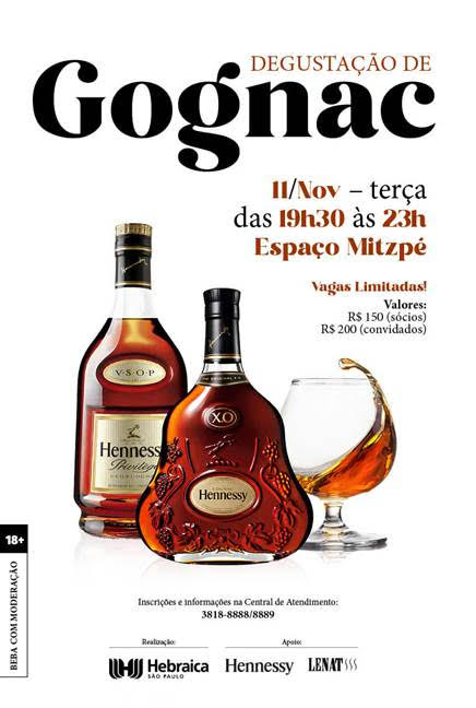 A Hebraica promove no dia 11 de novembro, das 19h30 às 23h, no Espaço Mitzpé, uma noite de degustação de cognac.