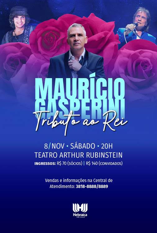 Prepare-se para reviver grandes sucessos no show “Tributo ao Rei”, com Maurício Gasperini. Os ingressos custam R$ 70 para sócios e R$ 140 para convidados.