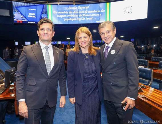 O senador Sergio Moro (na foto com Ilana Trombka e Claudio Lottenberg), autor da iniciativa que também contou com o apoio do presidente do Senado, Davi Alcolumbe, abriu e concordou com o evento de forma impecável, manifestando solidariedade às famílias das vítimas e às que ainda aguardam a liberação de suas entes retidas em Gaza. “Hoje estamos aqui reunidos para cumprir um dever que transcende ideologias”, disse Moro, ao lembrar os ataques em que mais de 1.200 pessoas foram brutalmente assassinadas pelo Hamas e outras mais de 200 sequestradas. Moro defendeu o direito de Israel à autodefesa, previsto na legislação internacional. “Infelizmente esses ataques nos remetem a outros crimes perpetrados contra os judeus”.