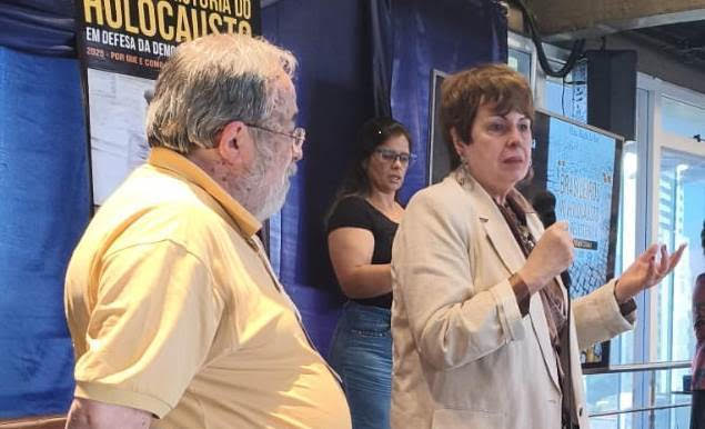 O evento teve abertura solene com representantes das instituições promotoras e contou com a palestra da Profa. Dra. Maria Luiza Tucci Carneiro (foto), que destacou o Holocausto como genocídio singular na história. Em seguida, o Dr. Marcos Toyansk abordou o anticiganismo e George Legmann emocionou o público ao compartilhar seu testemunho como sobrevivente, após um vídeo em homenagem aos 80 anos da libertação do campo de Dachau. 🕯️