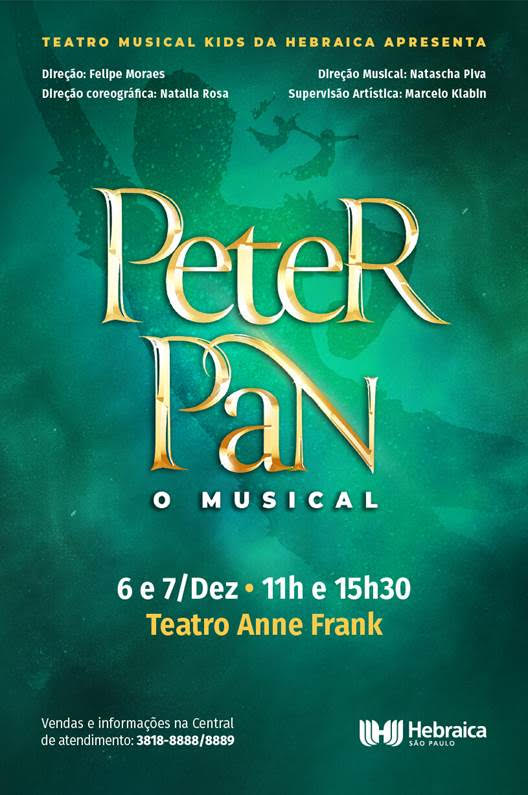 A Hebraica apresenta o Teatro Musical Kids com o espetáculo “Peter Pan: O musical”, nos dias 6 e 7 de dezembro, respectivamente às 11h e às 15h30, no Teatro Anne Frank. A direção é de Felípe Moraes, com direção musical de Natascha Piva, direção coreográfica de Natalia Rosa e supervisão artística de Marcelo Klabin.