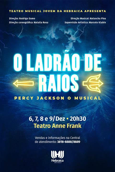 O Teatro Musical Jovem da Hebraica apresentará o espetáculo “O Ladrão de Raios: Percy Jackson, O Musical” nos dias 6, 7, 8 e 9 de dezembro, sempre às 20h30, no Teatro Anne Frank. A montagem tem direção de Rodrigo Damo, direção musical de Natascha Piva, direção coreográfica de Natalia Rosa e supervisão artística de Marcelo Klabin.