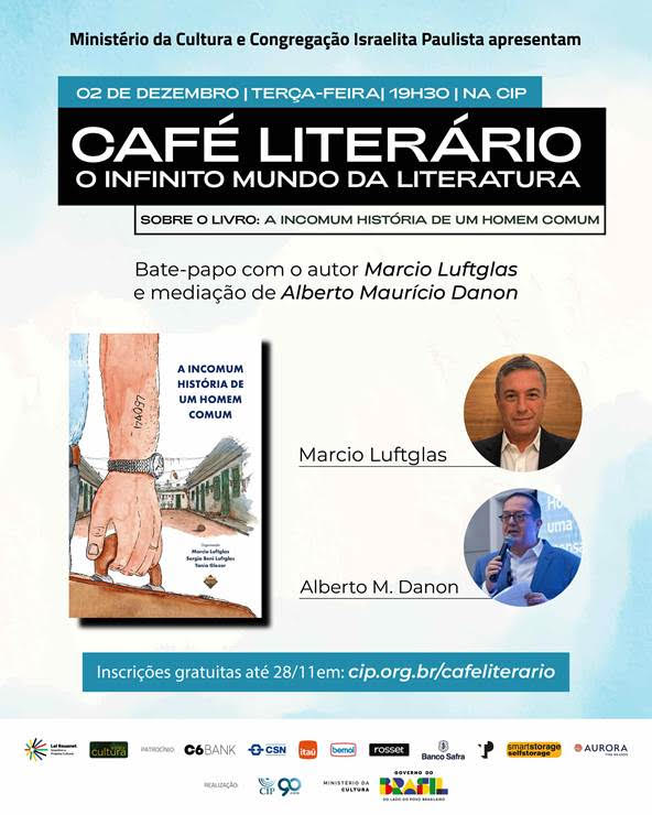 A Congregação Israelita Paulista (CIP) realiza no dia 2 de dezembro, às 19h30, mais uma edição do Café Literário, reunindo literatura, memória e diálogo. O encontro apresentará o livro “A Incomum História de um Homem Comum”, com a presença do organizador da obra, Marcio Luftglas e mediação do jornalista Alberto Maurício Danon.