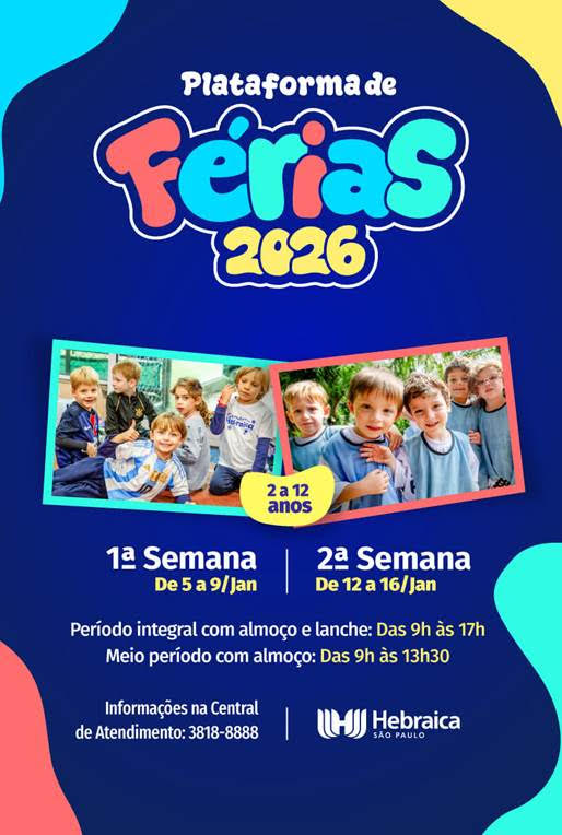 Prepare-se para um verão cheio de diversão, aprendizado e conexões inesquecíveis! A Plataforma de Férias traz uma programação repleta de oficinas criativas, atrações emocionantes, brincadeiras animadas e vivências judaicas que fortalecem amizades e valores. Com períodos integral e parcial, incluindo refeições, nossas semanas de atividades são perfeitas para crianças viverem momentos únicos e inesquecíveis.