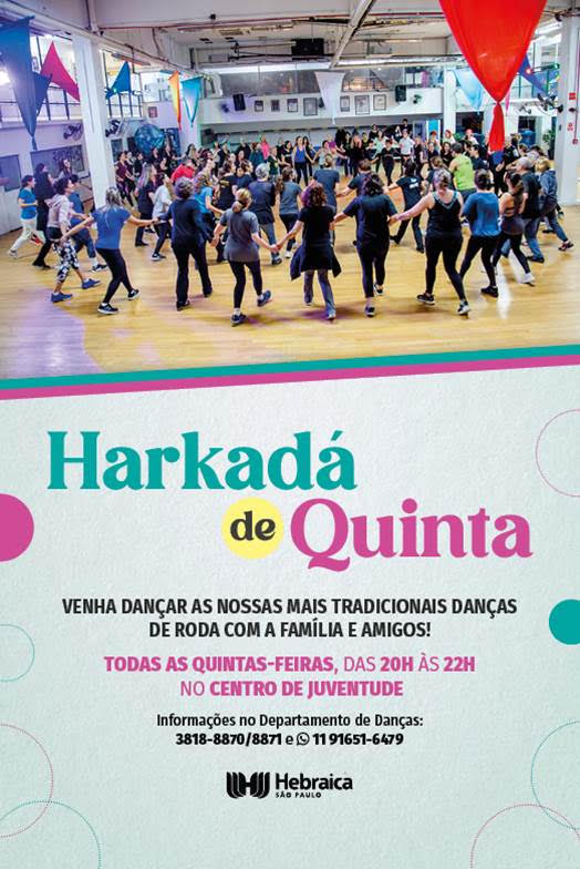 Participe da Harkadá de Quinta, um encontro para juntos celebramos a tradição judaica com a família e amigos. Esperamos você para uma grande celebração cultural, unindo tradição e união através da dança. Venha viver momentos inesquecíveis.