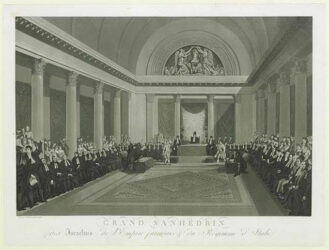 Napoleão tinha grandes planos para seus súditos judeus, incluindo a criação de um corpo jurídico supremo judaico, que ele chamou de “Sinédrio”, em homenagem ao antigo tribunal superior judaico. No entanto, isso era menos sobre apoiar a lei judaica e mais sobre controlar a vida judaica para se alinhar com suas políticas. O experimento não durou muito — apenas alguns meses após sua criação, Napoleão enfrentou reveses em sua campanha russa e o “Sinédrio” foi dissolvido.