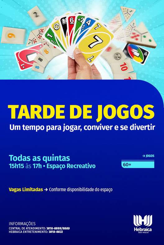 Participe da Tarde de Jogos e descubra novas formas de se divertir! Nosso Espaço Recreativo estará aberto para você aprender e experimentar diferentes jogos em um ambiente descontraído. As vagas são limitadas conforme a disponibilidade do espaço.
