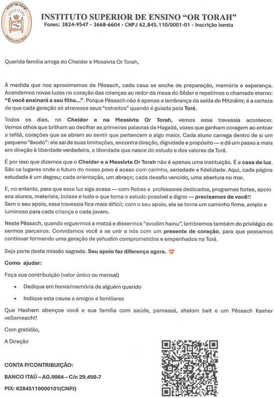 CARTA DE PESSACH DO INSTITUTO SUPERIOR DE ENSINO “OR TORAH”